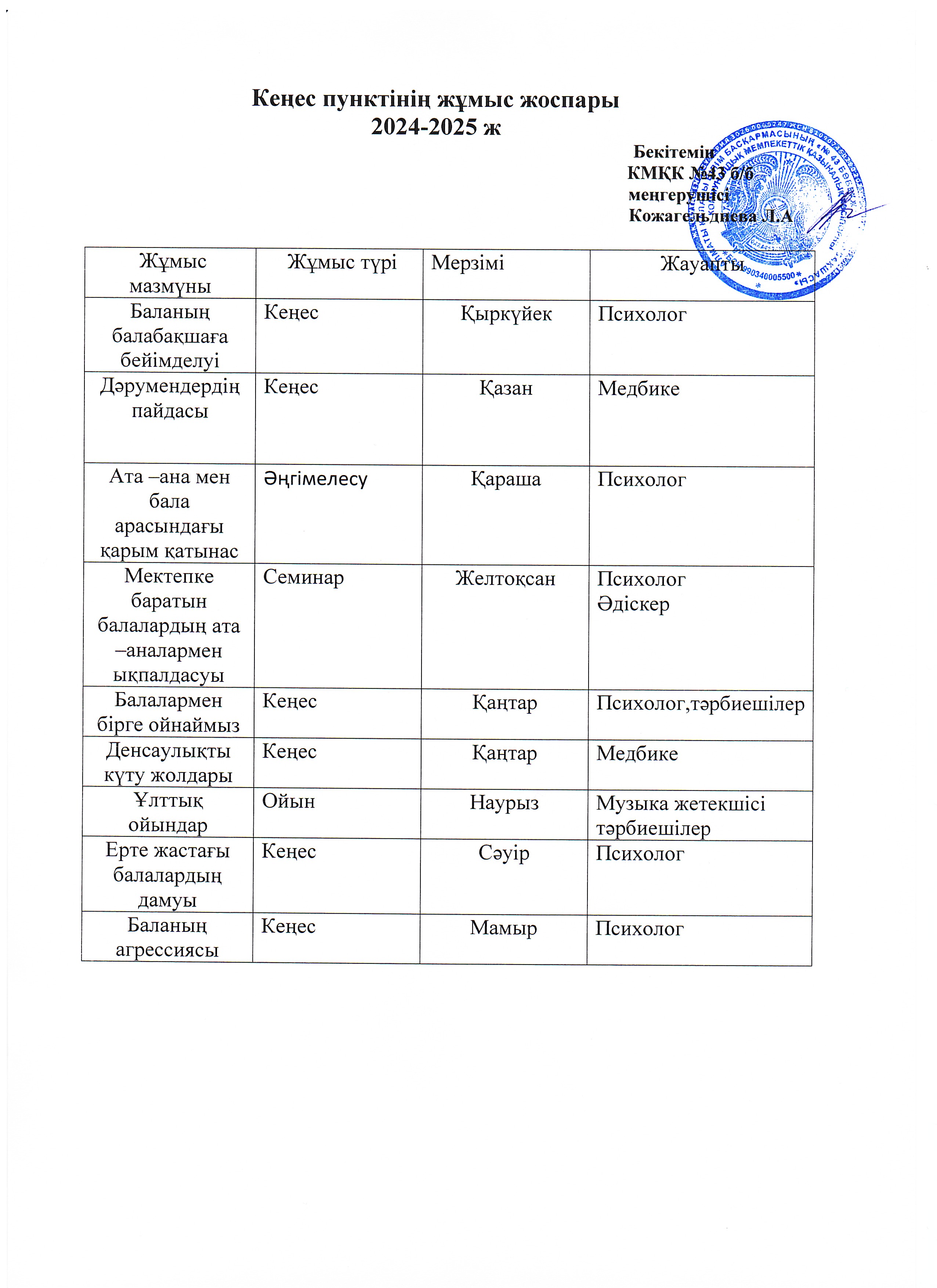 Кеңес пунктінің 2024-2025 ж жұмыс жоспары