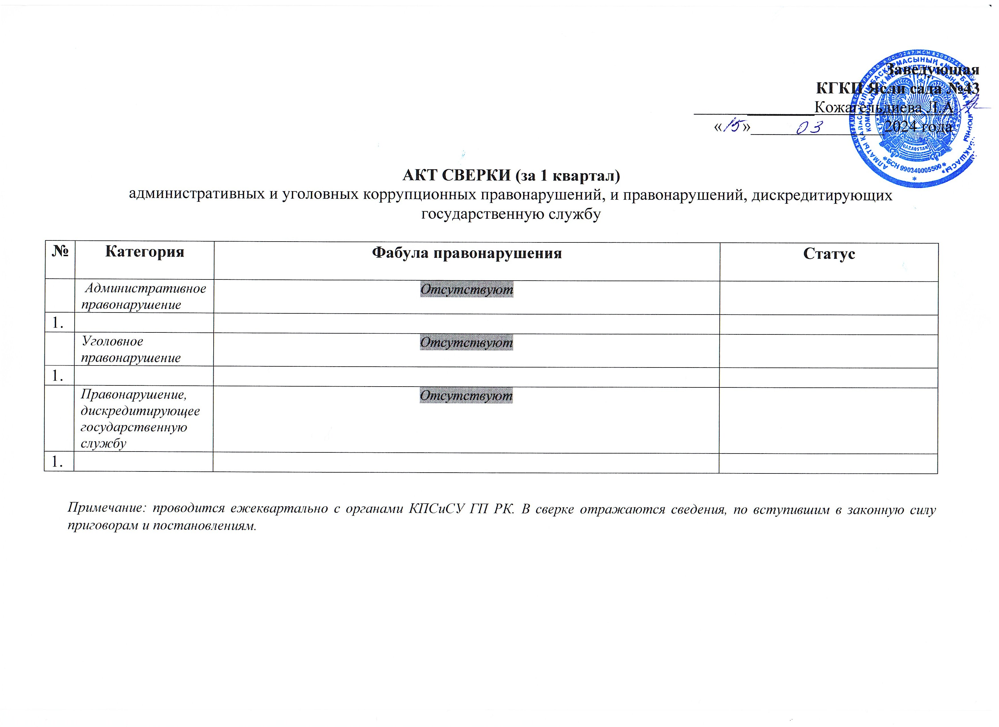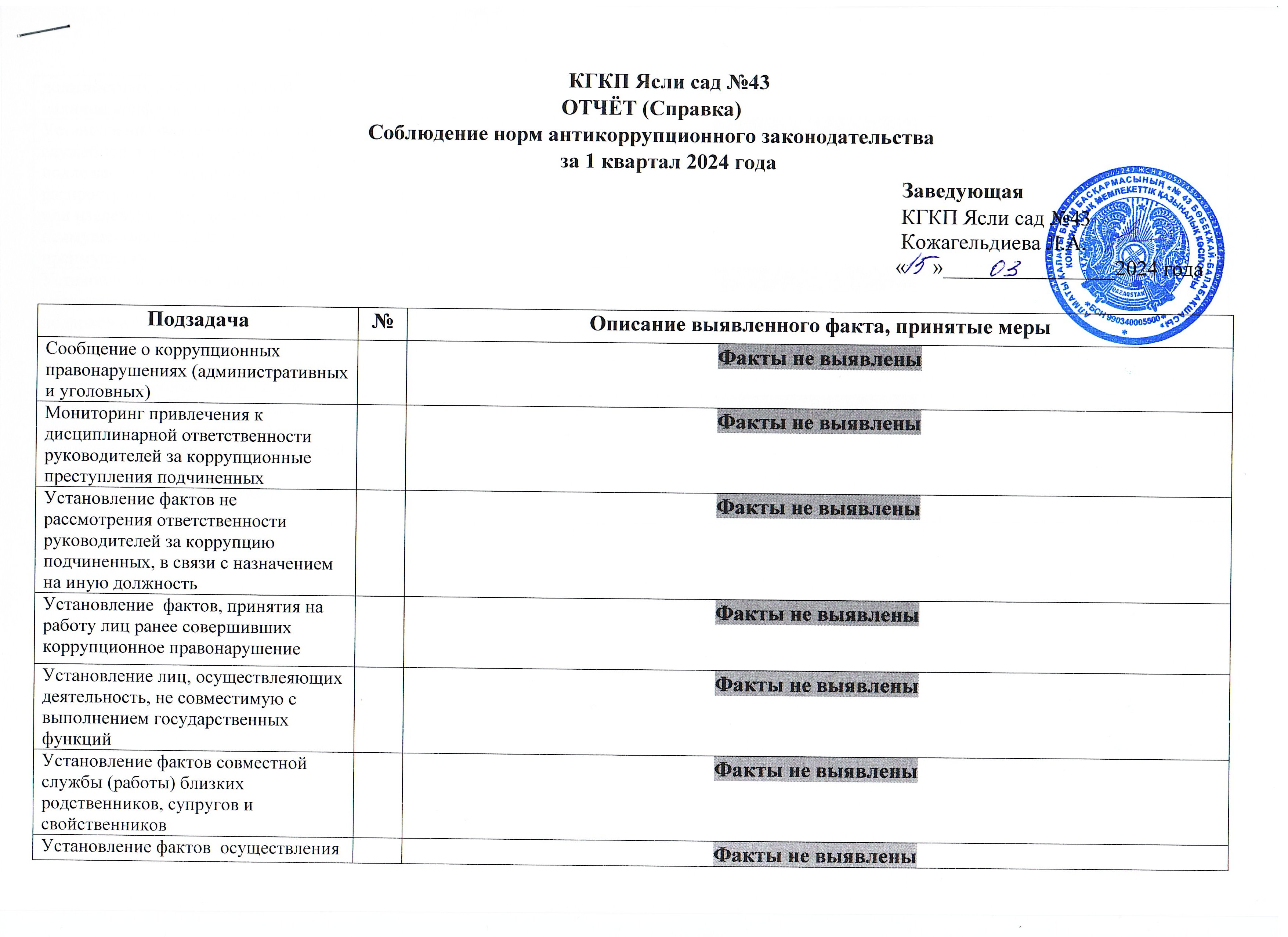 15 наурыз 2024 0 1 2 3 4 5 ОТЧЁТ (Справка) Соблюдение норм антикоррупционного законодательства за 1 квартал 2024 года