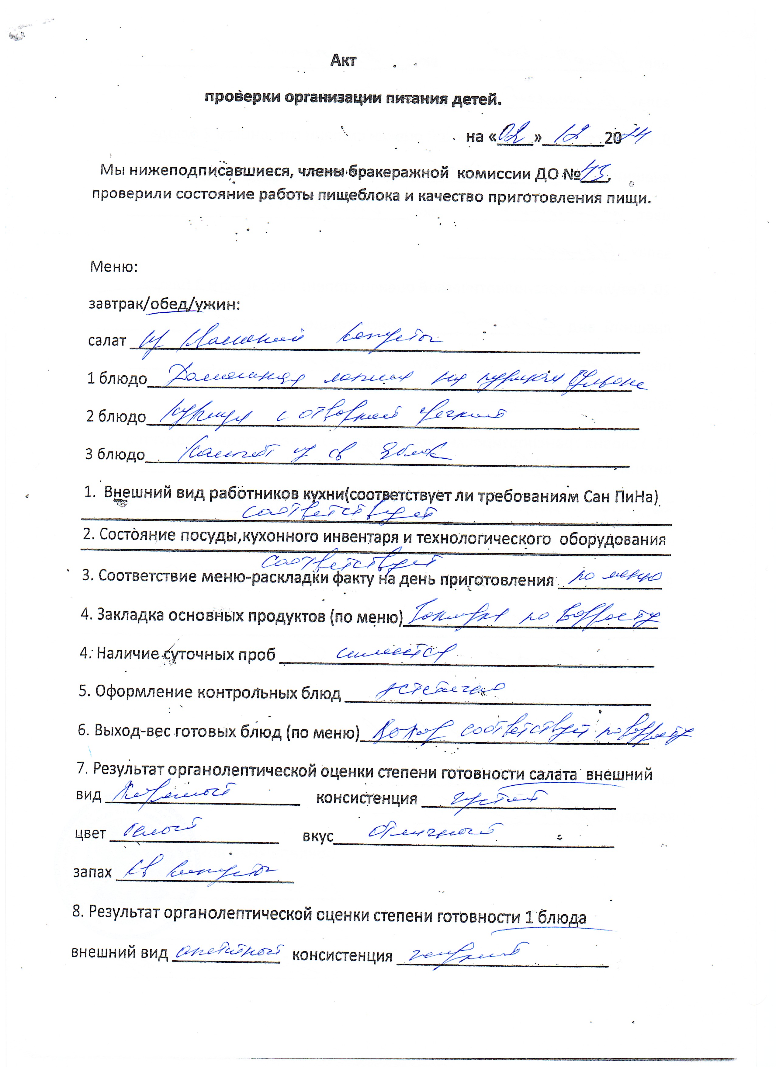 Ас мәзіріне бақылау жүргізу актісі/ Акт проведения контроля за меню