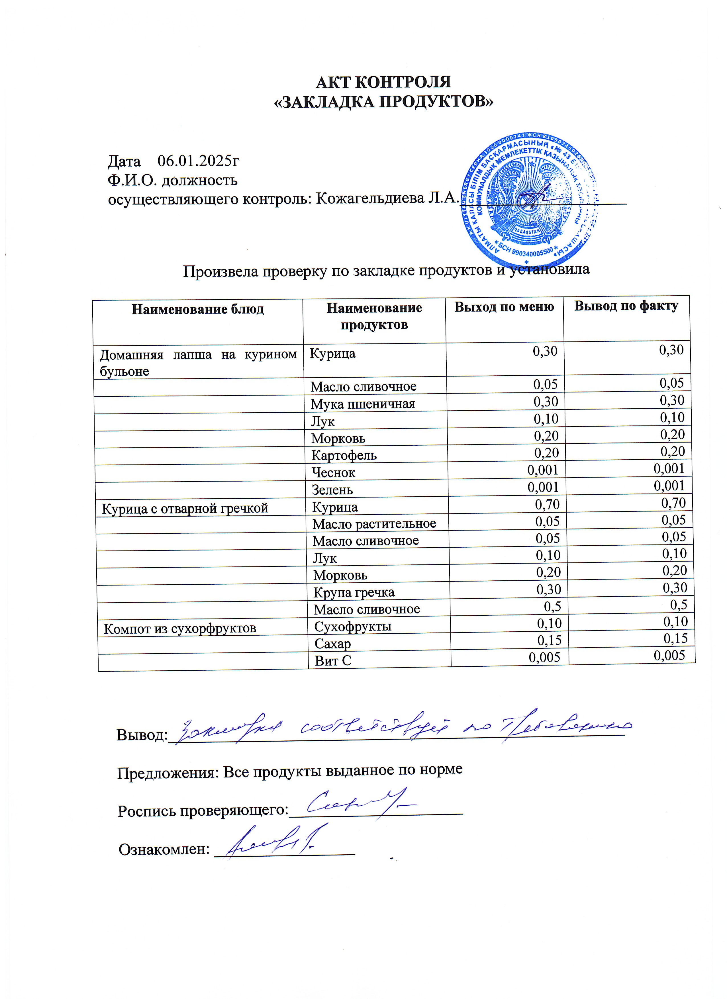 Ас мәзіріне бақылау жүргізу /акт проведения контроля за меню 06.02.2024 г