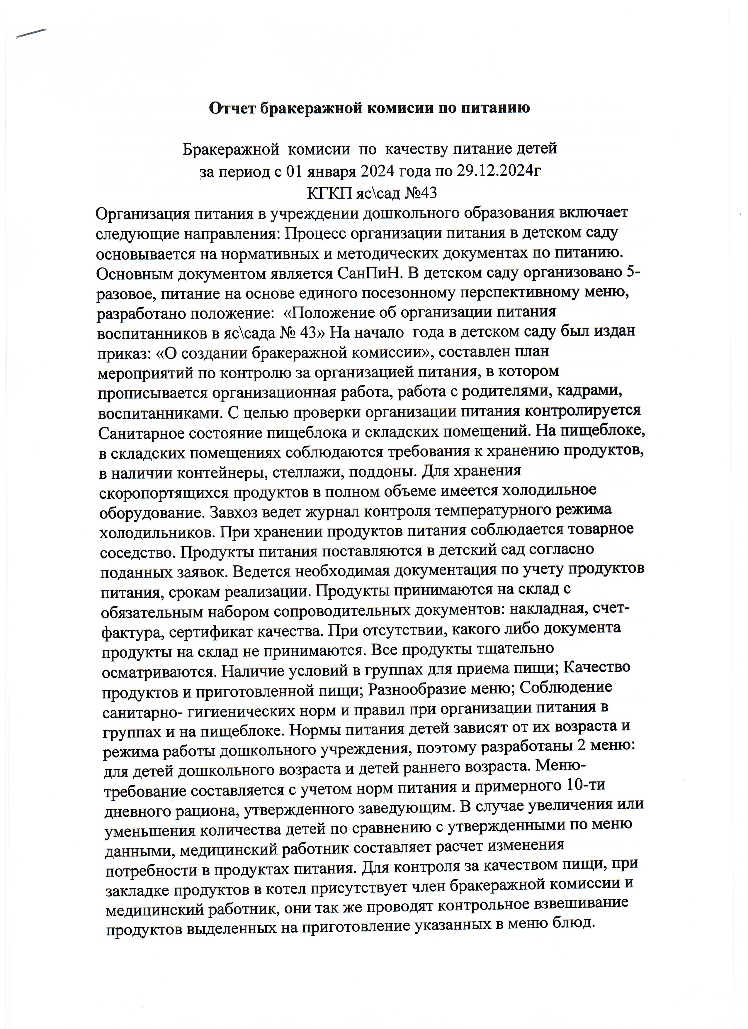 Отчет бракеражной комиссии по питанию